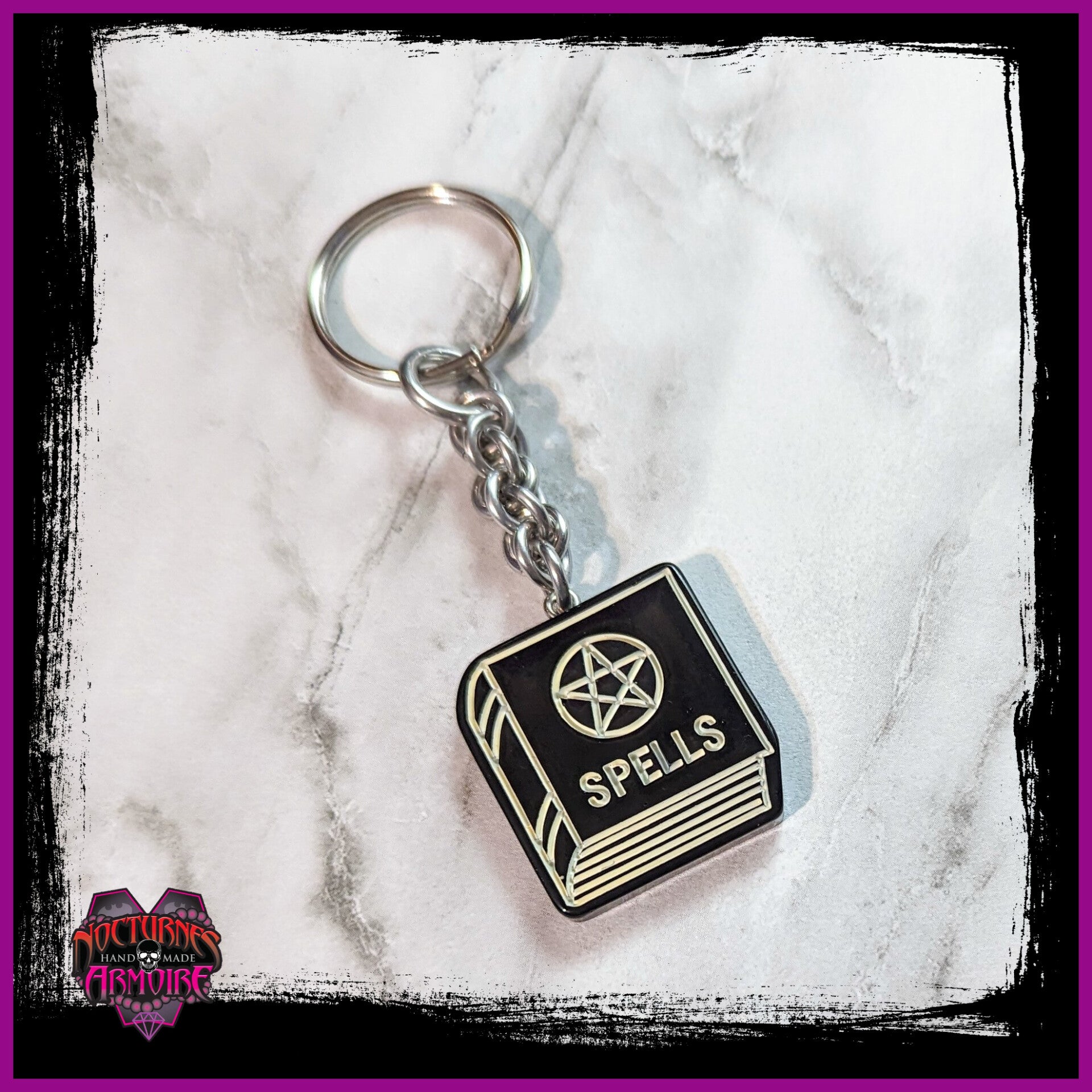 silver, keychain, keyring, accessories, witch, spell book, witchy, black, white, handmade, small business